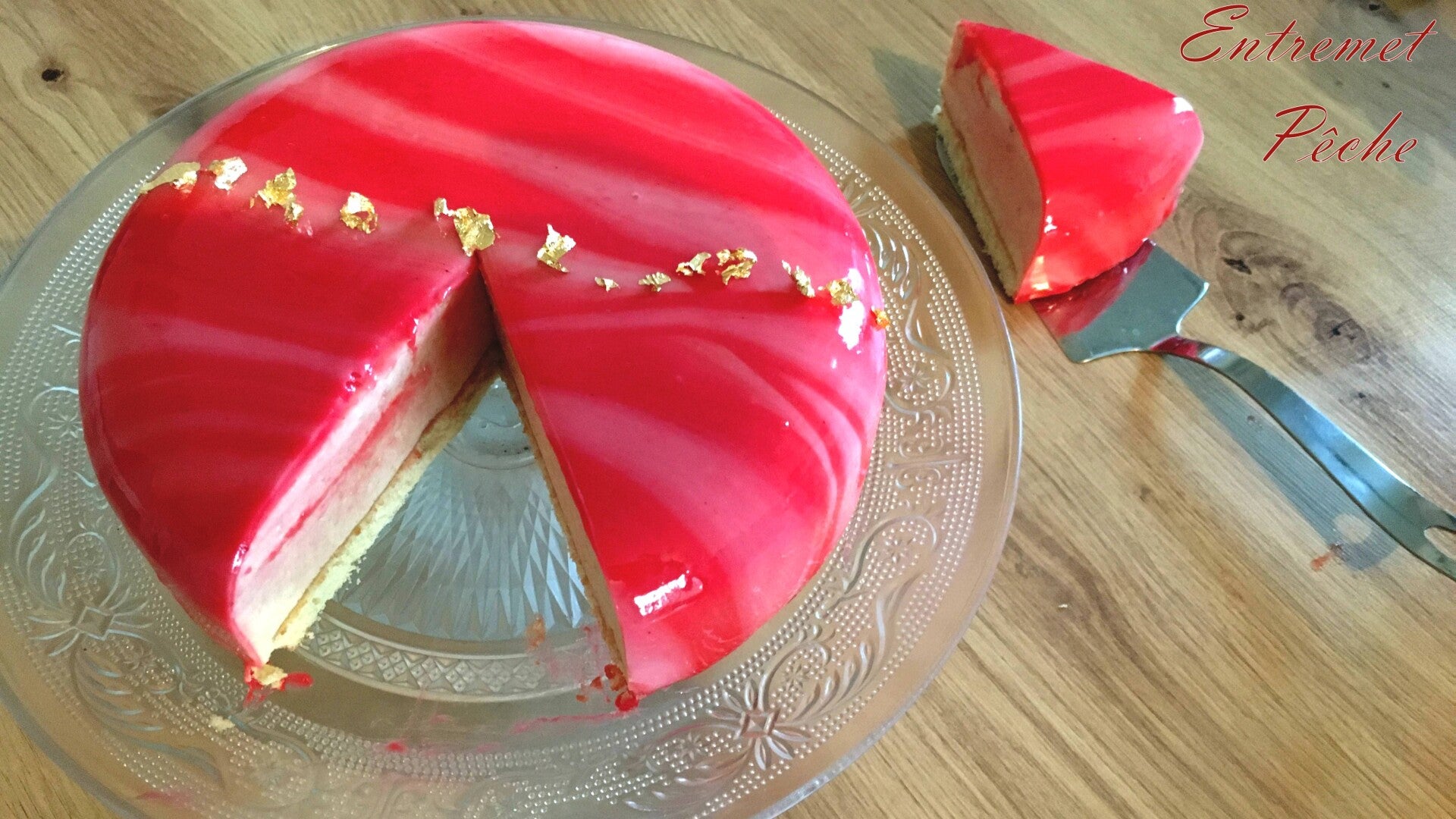 Cette entremet est composé d'une génoise sur une fine ciuche de chocolat croustillant et d'une douce mousse à la pêche, enrober d'un glaçage miroir aligner de merveilleux feuille d'or. 8 parts