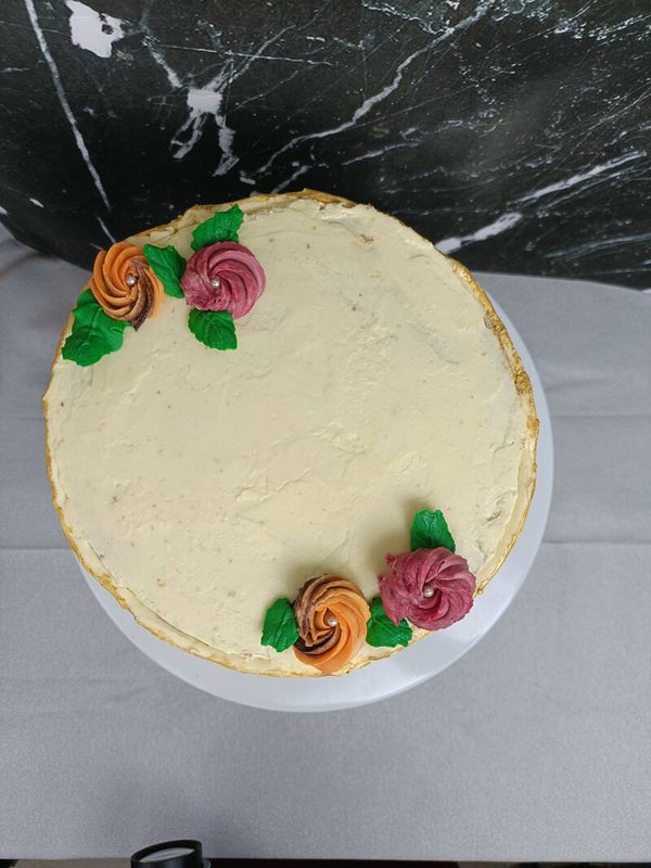 Layer cake composé d'une génoise vanille, sur un lit de crème mascarpone et fruit rouge, avec un sompteux chocolat croustillant, ainsi qu'une crème au beurre pour la couverture. 15 parts à 22 parts.
